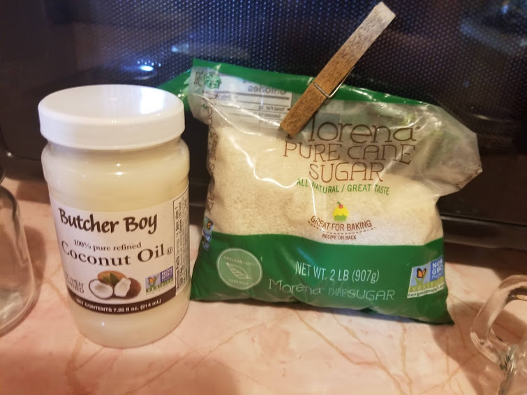I want to share how I make a favorite bath item for myself, it is sugar scrub! I love sugar scrub because it is an excellent exfoliate that is not too harsh on your skin. I have very sensitive skin so that is important to me. Exfoliating at least once a week is recommended to keep your skin vibrant and to fight cellulose buildup. I also love this recipe because it is all natural. It only contains two ingredients and both of them are great for you.